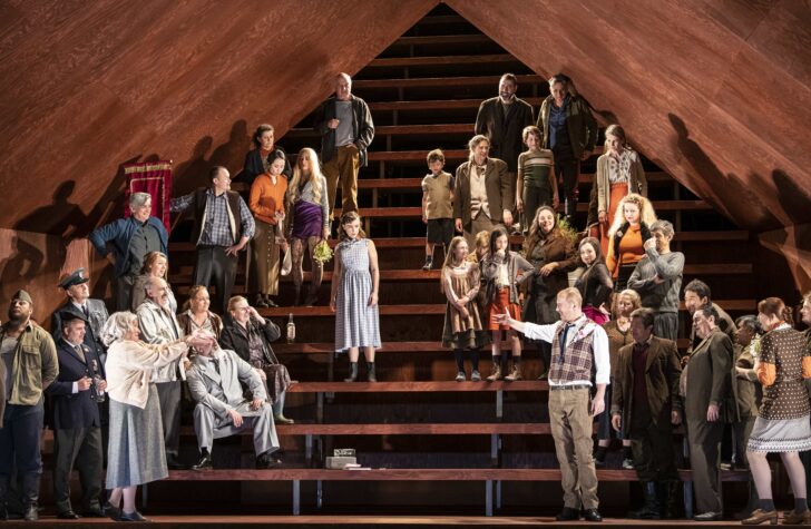 Si la metteure en scène Tatiana Gürbaca raconte assez fidèlement ce qu'il y a d'écrit dans le livret, elle minimise les aspects psychologiques et les enjeux entre les protagonistes. Ses personnages manquent d'épaisseur. Si les principaux chanteurs s'en sortent grâce à leur talent propre, les autres personnages gravitant autour de ce drame ne reflètent leurs sentiments guère autrement que dans la convention. Malheureusement, en voulant donner au décor (Henrik Ahr) une intention plus symbolique que réelle, celui-ci s'avère à la fois trop pesant en même temps qu'étriqué. Compliquée à occuper, cette maison flanquée de hauts gradins qu'on monte ou qu'on descend malhabilement au gré de l'action, apparait trop neuve pour une famille qui n'a d'autres ressources qu'une seille métallique pour tout berceau du nouveau-né.