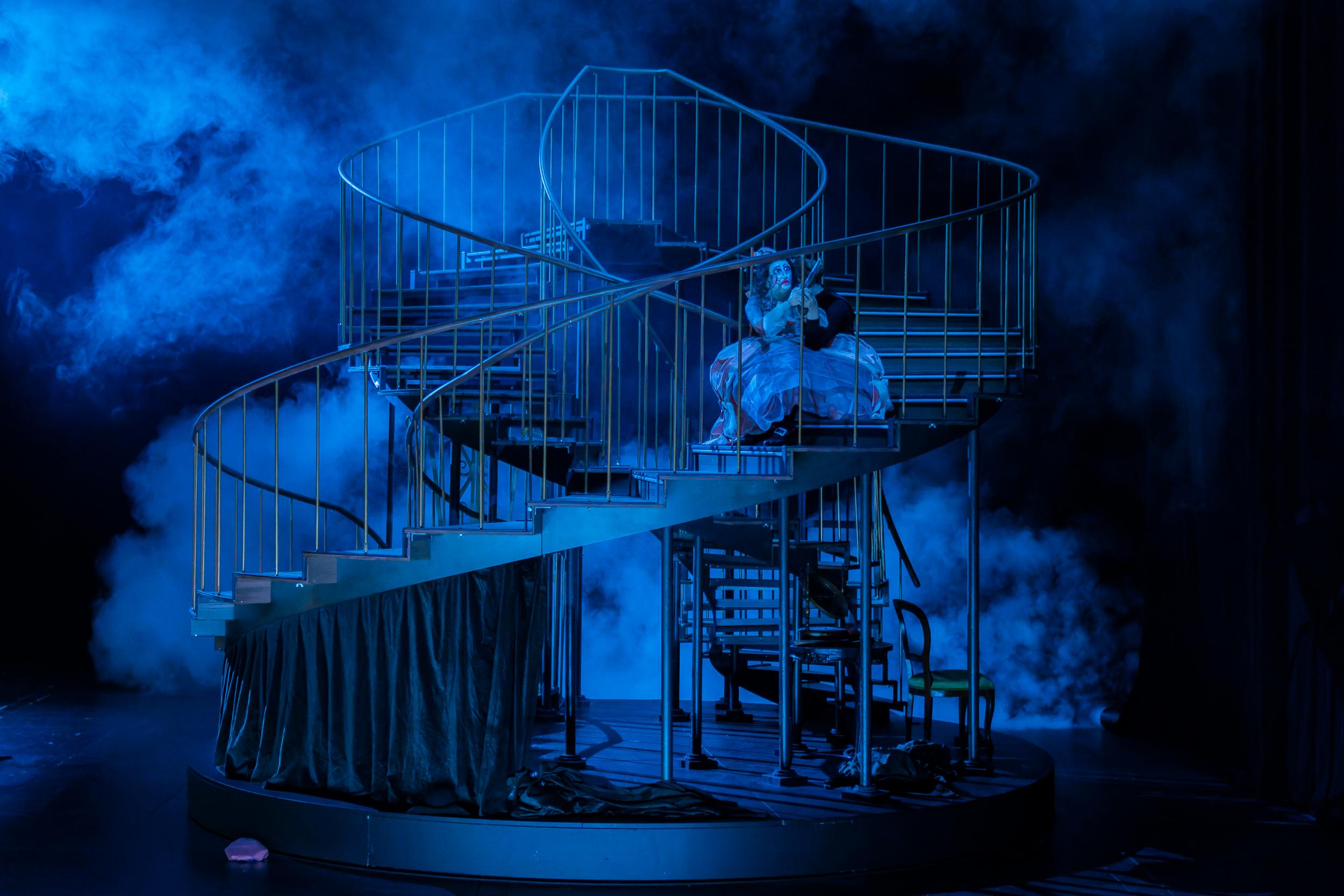 L'action commence tambour battant dès que Fiorello a fait apparaître les six marionnettes encore inanimées sur un portant. Jamais contrainte par l'espace exigu que lui laisse l'orchestre placé à jardin sur le plateau, elle tourne autour d'un escalier tournant lui aussi sur lui-même pour faire peu à peu apparaître l'ADN de son concept : une très métaphorique double structure hélicoïdale à double entrée séparant ou unissant les destinées. Tout le Barbier de Séville est bel et bien là, dans ce « Barbier de Bâle », avec son imparable scénario, son humour redoutable et sa merveilleuse partition, utilisés avec un vrai talent de conteur pour la comédie et ses arrière-plans par Nikolaus Habjan. Les huit hommes du chœur ne sont pas oubliés par le fusain facétieux du metteur en scène. Les rires le disputent idéalement au trouble : tout fait mouche.