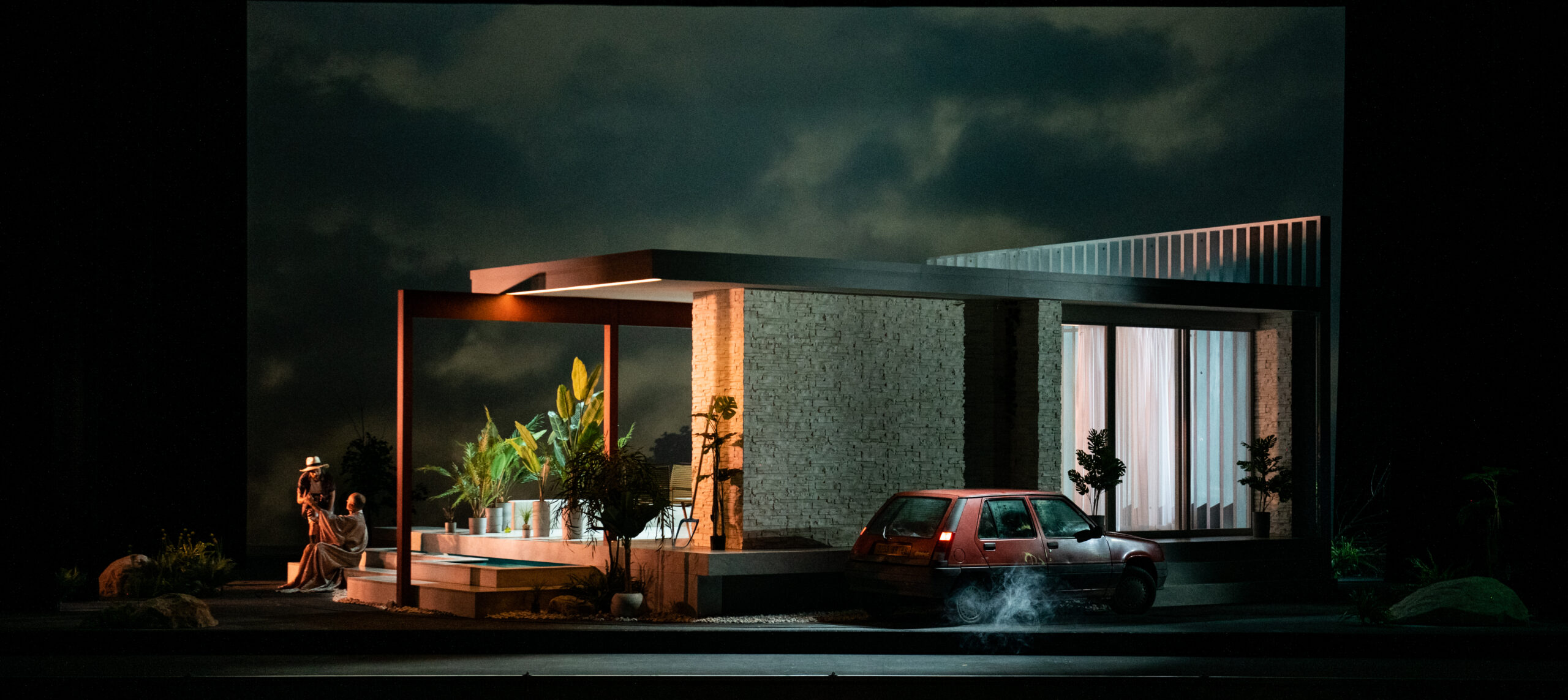 La metteuse en scène allemande Amelie Niermeyer, plutôt versée jusque là dans la tragédie (Wozzeck, La Clémence de Titus, Cardillac ou Otello) navigue très à l'aise dans les rebondissements d'une intrigue qu'elle utilise à des fins libertaires (une très transgenrée fiesta avec un Ernesto en chaussures à talons devant une banderole amore liberto) et, au final, ouvertement féministes : sa Norina échappera au vieux Pasquale, mais fuira également les bras du jeune Ernesto, comme si elle avait eu vent du destin de la Rosina en feu du Barbier devenue la Comtesse congelée des Noces. Une probabilité vraisemblable vu que cette nouvelle production prend ses quartiers dans un riche bungalow des années 70. Le luxueux décor réaliste de Marie-Alice Bahra est mis en valeur sous tous ses angles par une tournette, parfaite métaphore de la girouette folle qui s'abat sur un quotidien réglé comme du papier à musique : visite guidée de tous les espaces de vie de la riche demeure de Don Pasquale: le mur à poubelles, ou encore celui qui donne sur la rue où stationne la R5 dans laquelle vit Norina. Pasquale, veillé par un désopilant trio de domestiques aux ordres, est un homme qui prend soin de son corps. La première image montre, au petit matin, deux jambes nues déjà en action par-delà le confortable canapé qui jouxte la piscine. Première surprise que ce numéro de charme qui laissait supposer un autre propriétaire que celui dont le corps apparaît ensuite en entier : ces jambes ne sont pas celles de Norina mais celles de Pasquale !