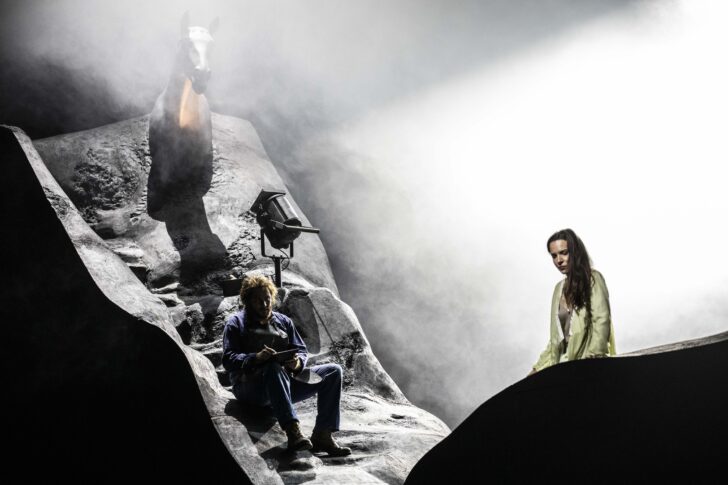 Richard Brunel et les équipes de l'Opéra de Lyon ont conçu pour Shirine un magnifique livre d'images. C'est à un livre que fait immédiatement penser le décor d'Etienne Plus. Un livre en mouvement, posé dans une végétation intemporelle, un livre dont les pages se tournent, et où apparaissent des portes que des héros toujours en mouvement sont invités à franchir. C'est aussi d'une porte gigantesque ouverte en fond de scène, qu'au huitième des douze tableaux de Shirine surgit d'une mer de vapeur un pan entier d'une montagne elle aussi en mouvement. Ce vertigineux bloc de pierre, tournoyant sur lui-même de manière à pouvoir être contemplé sous tous ses angles, fait du huitième tableau de Shirine le sommet d'une production soucieuse de chocs esthétiques.