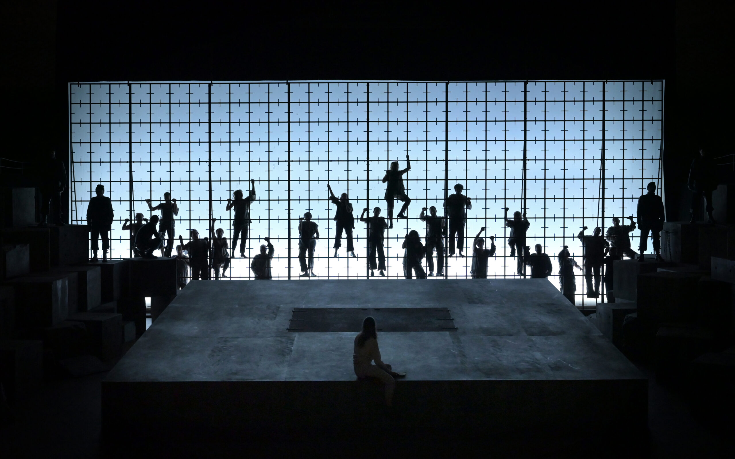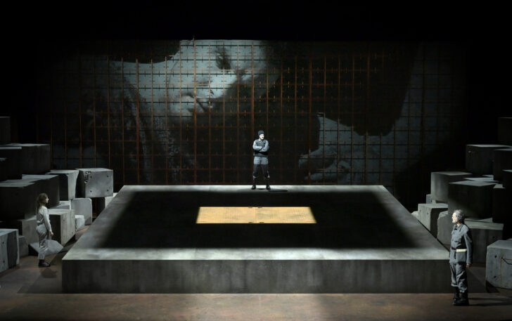 Une latitude que la mise en scène laisse se déployer à loisir. Reconnaissons cependant à le mérite d'une scénographie parfaitement adaptée à l'espace de jeu permis par La Seine Musicale : une carrière de pierres taillées disposées de part et d'autre d'une sorte de citerne qui pourrait être réutilisée dans Salomé, et autour de laquelle les protagonistes tournent comme des phalènes. Cet espace aride, remodelé aux moments les plus noirs de l'œuvre par une vidéo mouvante, est cadenassé par de terrifiants bruits de serrures et de chaînes. Les protagonistes, vêtus d'uniformes identiques, sont ceux de tous les Fidelio intemporels d'un passé lointain. Sobre avant tout, Bobbée ne révèle ni style ni ambition de réveiller la vigilance politique des cerveaux contemporains. La vidéo intéresse mais reste sous-employée : Léonore chante prosaïquement son grand air à la rampe alors que, montrant la brûlante héroïne de Beethoven noyée dans les lignes de fuite menaçantes qui s'activent dans son dos, l'image aurait acquis davantage de force. Une force que l'on admire en revanche au moment de la très belle scène des prisonniers escaladant, dans un contre-jour bleuté, le grillage du fond de scène. Ou encore à l'apparition de Florestan crucifié d'étais de bois.