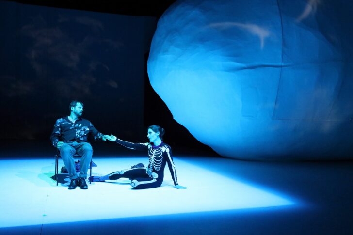 La mise en scène de Thomas est confiée à , connue en Allemagne pour son goût pour le théâtre musical expérimental, volontiers conceptuel. Pas de doute, ce spectacle ne manque pas d'ambition, mais il n'est pas à la hauteur de ce qu'il semble promettre. Au début du spectacle, nous dit-on, le public se trouve à l'intérieur d'un corps humain : sur une sorte d'énorme rocher qui occupe une bonne partie de la scène sont projetées les images d'organes palpitants, et on entend la respiration de Matthias, jusqu'à son dernier souffle. Par la suite, à quoi sert ce rocher désormais simplement blanc, comme toute le reste de la scène ? Il faut attendre les dernières minutes du spectacle pour qu'il s'ouvre, révélant l'ensemble instrumental et ouvrant la dernière phase du spectacle, à grand renfort de fumigènes. Entre temps, il ne se passe pas grand chose, avec une direction d'acteurs qui reste prosaïque et des costumes qui ne le sont pas moins, à l'exception des deux infirmières venues laver le corps – on ne saisit pas quelle impression doivent donner les costumes en forme de sculptures de lumière qu'elles portent.