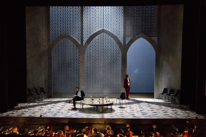 Pour Djamileh, tout se passe en un huis clos, avec le délabrement figuré du palais par ce pavement grisâtre : les faux-semblants et autres décisions iniques y sont figurés par les portes coulissantes, tels des couperets, d'un somptueux moucharabieh. Autre belle idée, celle de revêtir toutes les prétendantes, y compris Djamileh et sa potentielle « suivante » (rôle dansé superbement défendu par la chorégraphe Sonia Duchsene), d'un même uniforme féminin, robe stricte, bas et chapeau noirs, chaussures rouge vif à talons hauts.