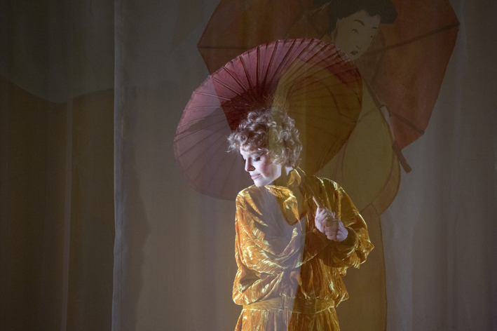 Pour La Princesse jaune, elle cadre l'action dans une chambre-atelier, sous le bienveillant regard de la peinture inspiratrice, et par le jeu des voiles et des transparences, métamorphose en un clin d'œil Léna en geisha capricieuse, revêtue d'un splendide kimono orangé, sur fond de salle devenue estampe géante, avec cette irradiante branche de cerisier en fleurs.