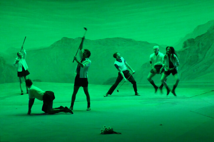 Dans la première partie, les danseurs paraissent observés par des caméras de vidéosurveillance, à moins qu'ils n'exposent leurs corps sur un Instagram partagé. D'ailleurs, le cercle de lumière suspendu au-dessus de leur tête n'est pas sans évoquer les anneaux lumineux utilisés sur les réseaux sociaux. On se met en scène en imitant les canons de la masse connectée. Le groupe danse, joue, s'amuse avec des clubs de golfs détournés de leur utilité – on pense aux pupitres du Bacchantes de Marlene Monteiro Freitas ou bien aux papiers dans son Mal – Embriaguez Divina. D'ailleurs, tout comme on le voit chez la chorégraphe cap verdienne, les danseurs grimacent, convulsent. Puis, comme guidés par cette voix féminine entêtante, les danseurs proposent des gestes lents, enivrants, qui manquent peut-être parfois de fluidité. Tout semble dire, jusqu'à un final libérateur où les corps semblent vivre à nouveau, que nous vivons contrôlés, que nos corps mêmes, dans leurs plus petites expressions, ne sont que la monstration d'injonctions au bonheur inquiétantes et angoissantes. Ce miroir tendu à nos égarements contemporains vise juste et déstabilise fortement.