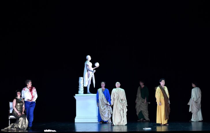 Le synopsis de ce grand succès de l'opera seria haendélien est digne d'un peplum. César, victorieux de Pompée, arrive en vainqueur en Égypte où Ptolémée veut ravir le pouvoir à sa sœur Cléopâtre. L'usurpateur fait assassiner Pompée pour enlever sa veuve Cornélia, défendue par son fils Sextus. Pour reconquérir le trône d'Égypte, Cléopâtre met tout en œuvre pour séduire César. Le tout sous le regard implacable des Parques qui emprisonnent les personnages dans la toile mortifère du fil rouge de leurs destinées. Viols, tentatives de suicide et d'empoisonnement, décapitation : la violence est omniprésente dans cette œuvre, et bien utilisée par la mise en scène, qui insiste sur la présence de la mort tout au long des trois actes : tête de Pompée offerte à César dans une caisse sanguinolente, cendres funéraires venues recouvrir le plateau, fil de la vie rompu par le ciseau des Parques, César couvert de sang lorsqu'il réapparait après son naufrage, et jusqu'à la prémonition de son assassinat futur à la fin de l'œuvre … Il y a ainsi une véritable trame narrative mortifère qui unifie le récit, symbolisé par la présence des Parques nues qui effectuent une sorte de danse macabre en fond de scène. Les mânes de Pompée sont aussi présentes, personnifiées par le corps dénudé du personnage assassiné, qui termine en statue de marbre sur son socle à la fin du troisième acte. La rencontre entre Philippe Jaroussky et le metteur en scène Damiano Michieletto date de 2019 à Salzbourg sur la production d'Alcina. Michieletto nous donne ici à voir une fructueuse collaboration entre mise en scène, direction musicale et chanteurs.