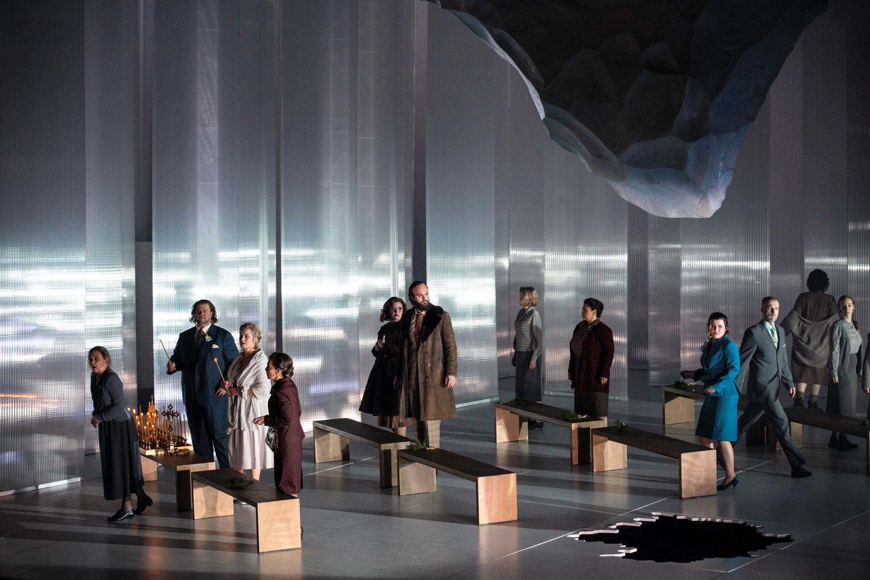 Damiano Michieletto est présent sur toutes les grandes scènes du monde. Une fois de plus, à voir cette Jenůfa, on se demande bien pourquoi. Le joli décor contemporain de Paolo Fantin a sa place dans un magazine de design, mais il ne dit rien, ou presque : à l'acte II, une masse descend des cintres quand Jenůfa dit en rêve qu'une pierre tombe sur elle ; à l'acte III, cette masse fond comme la glace qui va révéler le corps de l'enfant. Ce n'est certes pas faux, mais il ne fait ainsi qu'illustrer le plus évident de l'œuvre, ce qui est une vision pour le moins limitée des pouvoirs du théâtre. La direction d'acteurs est marquée par les conditions de la première en février 2021, en un temps de distanciation physique, où chacun doit rester à distance et où le chœur n'est généralement pas visible ; certains personnages sont raisonnablement bien dessinés (Laca, Jenůfa), d'autres beaucoup plus transparents : Jenůfa mérite mieux.