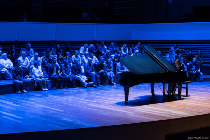 Une demi-heure plus tard, le même amphithéâtre inverse sa géométrie et accueille su scène un public à dessein plus confidentiel pour l'ultime étape de ce marathon pianistique. Vanessa Wagner a concocté un programme dont elle a le secret mêlant passé et présent et entame son programme par un bref hommage à Valentin Silvestrov avec trois de ses bagatelles opus 1, d'un extrême dépouillement néo-tonal, nimbées sous ses doigts diserts de nuances infinitésimales; au-delà de leur dehors inoffensif et nostalgique, ces miniatures prennent une portée tragique, celle d'un monde à jamais perdu, surtout au vu du récent exil du compositeur ukrainien dans les circonstances que l'on sait. A l'inverse de Claude Debussy, la Cathédrale engloutie, roidement architecturée, avec ces effets de crescendi-decrescendi millimétrés dans leur gradation et plus en encore les rares Masques, ici tour à tour fantasques ou ténébreux révèlent une musicienne passionnée, burinant les effets à pleine mains, loin de tout sfumato prétendument « impressionniste ». Le minimaliste et assez anecdotique Rain de Suzanne Ciani, donné très ludiquement mène à la création des sept préludes du jeune compositeur argentin Alex Nante, artiste en résidence pour cette saison auprès de l'ONL Vanessa Wagner présente donc succinctement cette suite inspirée par les sept Chakras, ces points-canaux d'énergie cardinaux dans le Kundalini Yoga suivants l'axe de la colonne vertébrale depuis le sacrum jusqu'au haute du crâne : il s'agit ici d'une progression de proche en proche vers la Lumière, au miroir des quatre éléments sorte de chemin vers l'illumination de la Sagesse. Nante y réalise une belle synthèse à la fois des courants néo-modaux, voire de lointaines réminiscences minimalistes (tendance Pärt), qui n'excluent ni l'âpreté des dissonances (prélude 2, image du Feu) voire une latente violence (prélude 6). L'on peut compter sur le savoir-faire, l'intelligence musicale, la curiosité face aux divers courants musicaux contemporains, et l'engagement de tous les instants de Vanessa Wagner pour magnifier cette musique, inclassable et, avouons-le, splendidement écrite et pensée pour l'instrument. En bis, la très dépouillée Lullaby de l'Américain Bryce Dessner nous permet après cette longue journée musicale de nous retirer en paix, dans la loi du silence retrouvé.
