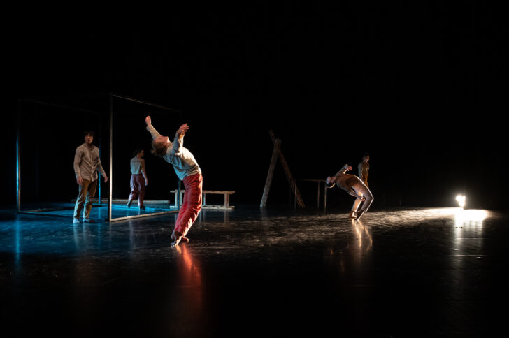 Tout d'abord, une fête. Un espace de libération, de joie, d'insouciance. Puis, très vite, les structures de la scénographe Coline Verguez viennent marquer des limites, des cadres, des ruptures entre les corps, comme autant d'entraves à l'épanouissement et à la rencontre. Les danseurs évoluent dans, sur et autour de trois cubes métalliques de tailles très différentes, qui agissent comme des espaces de jeu autant que comme des prisons. Des échelles de bois, bien que chaleureuses par leur matière, jouent un double jeu en offrant des possibilités d'envol et de libération, tout en pouvant constituer des obstacles infranchissables et étouffants.