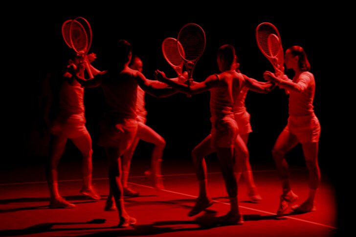 Une rangées de sièges baquet, un filet de tennis et quelques balles jaunes, c'est le décor insolite dans lequel évolue Kor'sia, la compagnie espagnole dirigée par Mattia Russo et Antonio De Rosa. Une évocation très proche du décor original de Teo Otto, dont deux dessins pour une nouvelle production du ballet Jeux (Poème dansé) de Claude Debussy peuvent être vus au Centre Pompidou dans l'exposition Nouvelle Objectivité.