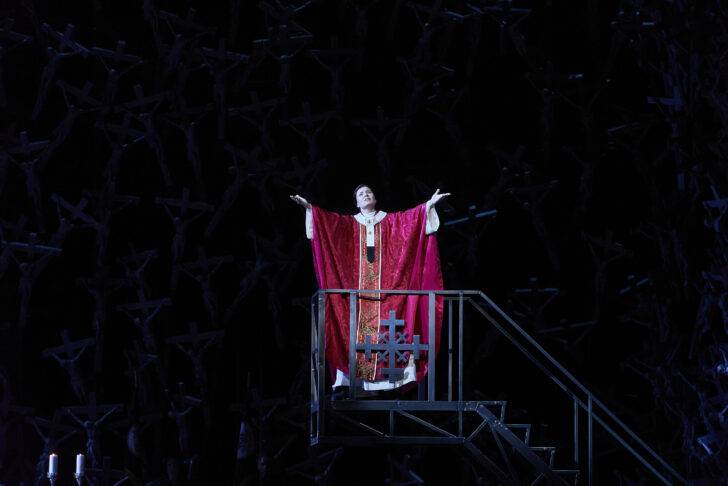 Si la belle scénographie d'Alfons Flores, exaltée par les lumières de Marco Filibeck et les costumes de Lluc Castells remportent tous les suffrages, il n'en va pas de même pour la lecture d'Àlex Ollé, copieusement huée au moment des saluts ! Il faut bien avouer que celle-ci, cohérente au demeurant et assez fidèle au livret en représentant les deux facettes de l'héroïne (prêtresse et mère) s'avère quelque peu provocatrice en transposant l'action dans une « atemporalité » constituée de deux tableaux principaux : une forêt de crucifix peuplée de pénitents encapuchonnés et de militaires armés, image de la collusion politico religieuse d'un catholicisme triomphant qui eut ses heures de gloire lors de la dictature franquiste et de l'Inquisition, deux époques assez mal vécues par le public espagnol ! Pour lui faire suite dans un curieux contraste, un second tableau figure un salon contemporain (?) avec télévision où Norma évolue avec ses enfants…
