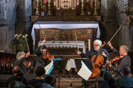 Sans leur tenue de concert (les aléas du trafic aérien) mais ravis d'arpenter la côte jusqu'à l'église de la Grave, des Hyères ou encore de La Salle-Les -Alpes, toutes bien sonnantes, le Quatuor Arditti donne la quasi intégralité des quatuors à cordes (n° 1, 2, 3, 4 et 7) de Pascal Dusapin qu'ils ont créés et enregistrés chez Aeon : archets acérés, geste énergétique et avancée implacable du discours nous tiennent en haleine durant les trois concerts dont ils nous gratifient. Se détache de la série des sept quatuors écrits à ce jour, le n° 2, Time Zones (1989) en 24 mouvements, sans doute le chef d'œuvre du compositeur dont la maîtrise du flux et les diverses facettes de l'écriture microtonale galvanisent l'écoute. Proche du n° 2 et superbe lui-aussi, le n° 7, Open Zone (40 minutes) déroule 21 variations à partir du geste inaugural de l'altiste et « invente son voyage par petits chemins », nous dit le compositeur, selon le principe rhizomatique cher à Deleuze.