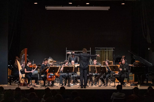 Les derniers concerts du festival sont délocalisés : dans la Salle du Dôme (Le Monêtier-les-Bains) d'abord, où le rendez-vous avec Le Balcon et son chef Maxime Pascal est désormais rituel. La soprano Jenny Daviet est au côté du pianiste Alphonse Cemin dans Chants de Terre et de Ciel d'Olivier Messiaen, un cycle vocal de six mélodies écrit à Petichet, dans le prolongement des Poèmes pour mi, avec, cette fois, la présence de l'enfant Pascal surnommé « Pilule » qui est né dans l'intervalle. Balançant entre amour physique et divin, le texte, de la main du compositeur toujours, est ponctué là encore d'Alléluias amplement vocalisés. Le soprano rafraîchissant mais léger de Jenny Daviet, au maximum de ses possibilités, est un peu à la peine dans son registre médium grave, bien secondé cependant par le piano effusif d'Alphonse Cemin qui, très à l'écoute, instaure un bel équilibre avec sa partenaire.