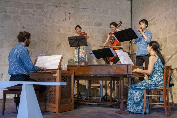 Le lendemain, sous le cloître de la collégiale, le trio baroque Les Timbres, rejoint par le duo japonais Harmonia Lenis, formé du magnifique flûtiste Kenichi Mizuuchi et de la claviériste Akemi Murakmi, offraient une réjouissante fantaisie autour de la Folia, ce tube des tubes depuis le XVIe siècle. Selon une audacieuse configuration pyramidale qu'ils affectionnent, ils délivrent un concert pédago-ludique avec la participation du public, qui chante joyeusement le motif initial de ces Folies d'Espagne. Ils ont choisi une douzaine de Folias, mais histoire de malicieusement compliquer les choses, les pièces ne sont pas jouées dans l'ordre alphabétique du programme donné et selon le style et l'époque, c'est au public de déterminer le compositeur de chaque Folia. Un jeu fort amusant, pas toujours simple. Si l'on reconnaît aisément la célèbre Sonate XII de l'opus 5 de Corelli, la Première suite en ré mineur de Marin Marais, la Pavana con su glosa de Cabezón, le Recerata Quatro sobre la Folia de Diego Ortiz, la Chaconne Z 730 de Purcell, les 12 variations sur ce thème de Carl Philipp Emanuel Bach, et la fameuse Sonate 10 La Follia de Vivaldi, il est moins facile d'identifier les pièces de Jean-Pierre Grignon, Bernardo Pasquini ou John Playford. Quoi qu'il en soit, Les Timbres et Harmonia Lenis s'amusent autant que le public dans ce programme joyeux et entraînant. Avec une connivence de tous les instants et un jeu d'un grand naturel, ils montrent une impressionnante virtuosité. Répondant à l'enthousiasme du public, ils le gratifient d'une treizième Folia composée au XXIe siècle par le japonais Nobe Uematsu, pour une musique de jeu vidéo. Ce thème est inépuisable et l'on pourrait continuer dans le temps avec les pièces, de Salieri, Liszt, Rachmaninov jusqu'aux facétieuses Folies ! de Thierry Huillet. Notons que parmi l'instrumentarium des deux ensembles, figurait un orgue positif du facteur Périgourdin Étienne Fouss, qui était joué ici pour la première fois.