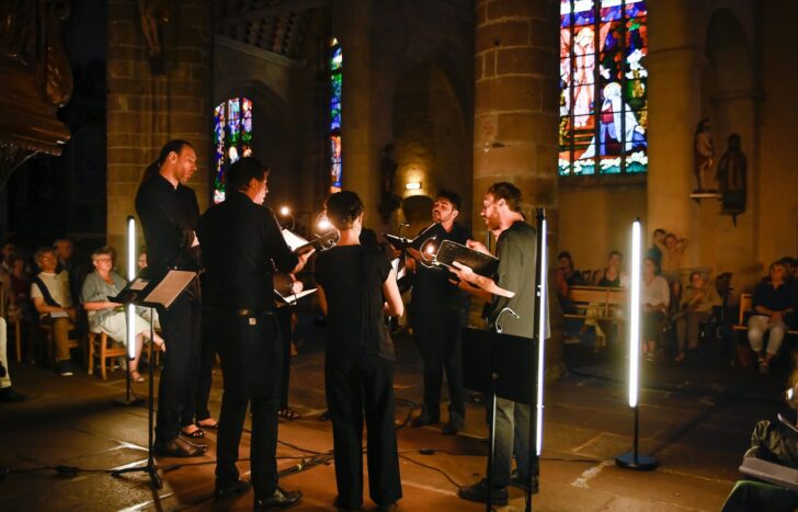 Un son qui émerge de la nuit qui penche déjà sur l'église Saint-Jean-du-Baly de Lannion et que magnifie progressivement une poignée de cierges électriques. On reconnaît les néons qui, dans Stabat Mater, étaient placés dans le chœur et qui, pour Hypnos, sont aussi disposés dans le public lui-même, qu'un dispositif quadri-frontal réunit autour du point névralgique de la soirée : sous la chaire un éblouissant cercle de lumière. Attirés là comme des phalènes, musiciens et chef n'en délaissent pas moins régulièrement cet endroit stratégique pour s'en aller tracer, dans l'église, lieu aux possibilités acoustiques infinies, des lignes physiques et vocales se rapprochant, s'éloignant, une heure et demi durant, du public. La démarche atteint des sommets au moment du Da pacem, Domine qu'Arvo Pärt composa en 2004 à la mémoire des victimes des attentats de Madrid (et que Lionel Sow redonna en 2016 au moment de ceux de Paris) : seul au centre de l'église, Simon-Pierre Bestion dirige huit voix invisibles dont la lente giration le long des murs de l'église agit sur une assistance peu à peu sous l'emprise de la beauté du geste et du son émis par chacun des musiciens, la voix de soprano faisant à elle seule monter les larmes. Hypnos pouvait, apprend-on, endormir aussi bien les hommes que les dieux.