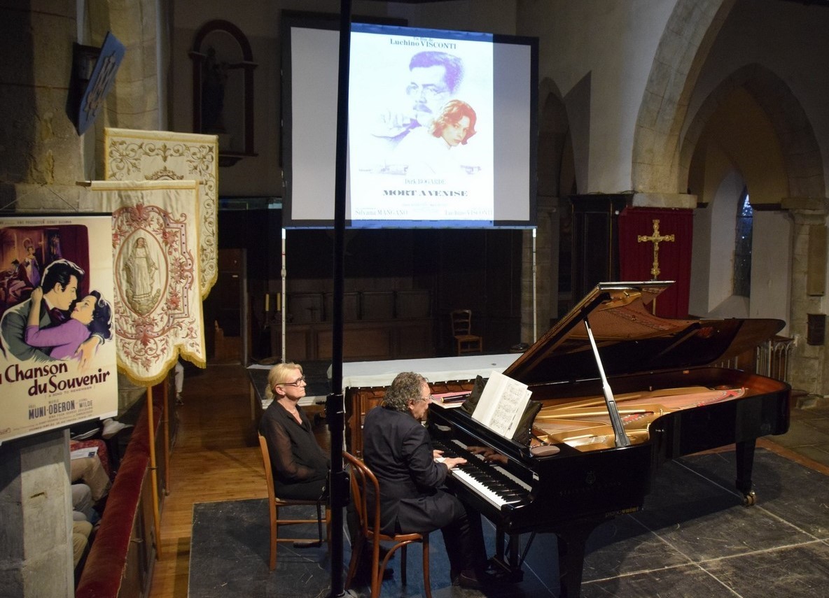 « Un décor hollywoodien pour la star du piano romantique », annonce Cornelia Lindenbaum-Desdoigts, présidente des Musicales : l'église de Pléguien, tapissée d'affiches de films, accueille Jean-Marc Luisada pour « Au cinéma, ce soir », hommage à ses parents récemment disparus, qui lui ont transmis, concomitamment à la passion de la Musique, celle du Septième Art pour lequel il confesse avoir développé « une passion qui a pris des démesures totales ». D'autres confidences suivent (Hélène Grimaud disant non à Bergman, Luisada : « Moi, j'aurais dit oui ! »), sur le mode d'une complicité sincère ou amusée fort réjouissante (« Vladimir Kosma : du Satie en mieux ! »), au fil de résumés très personnels de films ayant fait appel à la musique des grands compositeurs : la Fantaisie en ré mineur de Mozart en plein western de John Huston ; le Brahms des Amants de Louis Malle passant en majesté du sextuor au Steinway du festival ; le Mahler que le cinéma ressuscita en 1971, retranscrit par la science d'Alexandre Tharaud. Malgré la fatigue, malgré la touffeur de la journée, Jean-Marc Luisada fait sonner le somptueux registre grave de son instrument, s'adonne à l'ivresse technique (la Rhapsody in Blue qui magnifia le Manhattan de Woody Allen, la Valse Brillante qu'il arrache à la langueur hollywoodienne). La soirée, introduite par Nino Rota, se permet aussi d'autres clins d'œil (le jingle disparu du publicitaire Jean Mineur) avant de se conclure, au terme d'une kyrielle de bis, par la Valse en la mineur de Chopin, musique « la plus triste du monde », surtout en contrepoint du terrible Salò de Pasolini. Une soirée-fleuve (2h30 tout de même !) qui aura donné l'envie de voir ou revoir certains films (tel le Rendez-vous à Bray d'André Delvaux) et qu'on aurait suivie encore longtemps. Le virtuose était aussi un conteur.