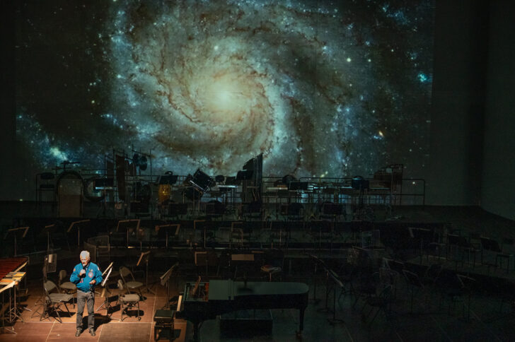 La dernière de ces trois soirées nous emmène encore plus loin avec des Canyons aux étoiles d'Olivier Messiaen : une œuvre démesurée, d'une dimension qui nous dépasse, une œuvre cosmique, « géologique et astronomique », mais aussi une œuvre mystique, « de louange et de contemplation ». Créée pour le bicentenaire des États-Unis, Messiaen s'est inspiré des Rochers de Bryce Canyon dans l'Utah et des chants d'oiseaux qui le peuplent ». 43 instruments de l'Orchestre de Chambre Nouvelle-Aquitaine sont rassemblés autour du piano, encerclés par une armada de percussions en tous genres. L'œuvre rarement donnée en concert est un évènement, l'occasion de vivre une expérience extraordinaire, musicale, sensorielle, dans sa spatialité sonore que ne permet pas autant le disque. Elle est d'autant plus exceptionnelle ce soir-là que le spationaute Jean-Loup Chrétien est là aussi. En préambule, il nous conte l'univers, son origine, le Big Bang, les planètes… Des images de la NASA sont projetées en pourtour de la scène. Celle d'une galaxie, puis celle de Jupiter, dont il nous donne à entendre la « vraie » musique, à partir des ondes électro-magnétiques captées par la sonde Voyager transformées en ondes sonores. Sur les sons de l'orgue qu'il joue lui-même, c'est ensuite un voyage dans le cosmos tout entier, à la surface du soleil, autour de Saturne qui prélude au grand voyage musical.