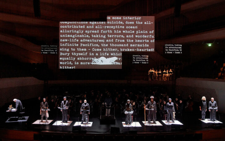 Une scène peu éclairée, des pupitres, des musiciens habillés en noir, un chœur d'enfants entièrement grimés de gris clair, un chœur d'hommes en habits de marin anthracites et des solistes dans les mêmes teintes, des textes et des images projetés en noir et blanc : l'atmosphère est sombre tout comme le propos de l'opéra. En effet la compositrice entrelace la destinée tragique du capitaine Achab et de ses matelots à la recherche de la baleine blanche, Moby Dick, et celle du père d'Herman Melville, ruiné suite à un krach boursier. L'ensemble de l'histoire est raconté par un narrateur campant le personnage du vieux Melville (excellent Johan Leysen). Des textes de Lautréamont, Lewis Caroll, Herman Melville, Edward Lear et Walt Whitman viennent densifier un propos déjà bien chargé rendant parfois la narration difficile à suivre.