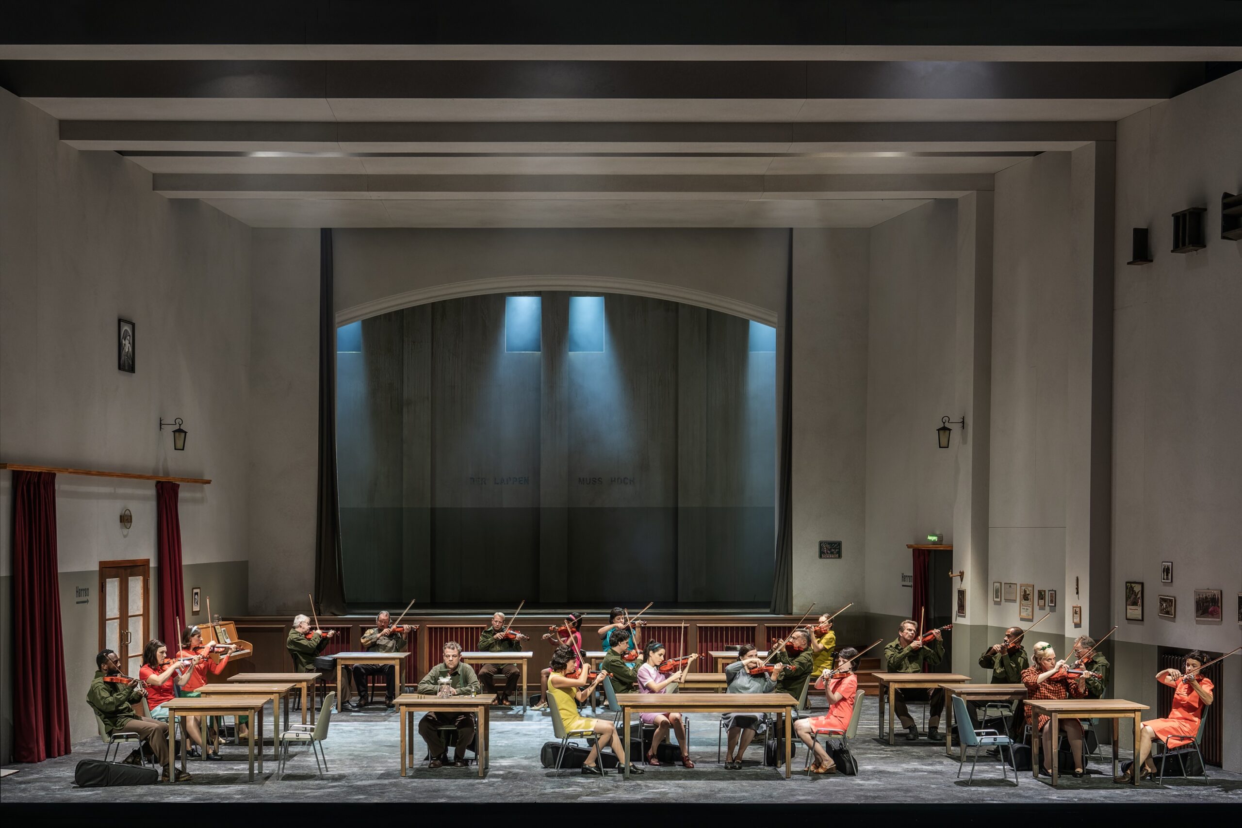L'ouverture commence donc, orchestre placé en haut de la fosse d'orchestre (il baisse et remonte à plusieurs reprises au cours de la soirée, jeu familier à Marthaler sur les artifices de la scène) ; le rideau s'ouvre ensuite, et… rien. Autour de tables d'une triste salle des fêtes, des personnages (ceux de l'opéra) trompent leur ennui devant leur chope, ne parlent pas, ne bougent pas. Silence total. Les premiers numéros de l'opéra mettront du temps à venir, et tout le spectacle est d'une lenteur qui est certes une marque de fabrique de Marthaler, qui joue constamment avec les attentes des spectateurs, mais a de quoi perturber des spectateurs non prévenus.