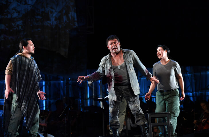 Placée au Corum pour assurer une jauge plus large qu'à l'Opéra Comédie, au moins cette proposition ne joue-t-elle pas la facilité d'une carte postale orientaliste. Car avec cette reprise de la production demi-scénique conçue par Annabel Arden pour Opera North en 2019, Montpellier fait en effet plutôt dans l'ascétisme, à défaut de réussir à véritablement passionner scéniquement. Et si l'artiste défend dans le programme de « faire le choix de ne céder à aucune égyptomania », aller récupérer des images des ruines d'Alep de Joanna Parker pour les passer sur un écran, en alternance avec des masques de plâtre qui s'effritent, revient à tenter une redéfinition abstraite bien pâlotte d'un livret pourtant concentré sur l'élément guerrier.