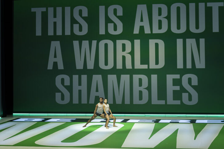 Benjamin Millepied est un ensemblier talentueux, il sait réunir autour de lui une équipe artistique exceptionnelle composée de Barbara Kruger, artiste contemporaine qui signe pour la deuxième fois une scénographie pour le chorégraphe, après Reflections en 2013, et Andy Akiho, compositeur surdoué dont les partitions pour percussions sonnent comme une déflagration. Les phrases géantes projetées par Barbara Kruger dans une boîte qui entoure les danseurs sont construites comme une anaphore commençant par : « This is about remembering and forgetting » puis « About, about, about ».