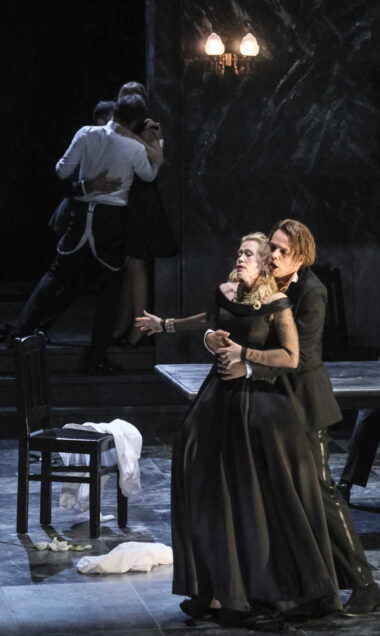 Dans le rôle central d'Els, seule femme en scène (hormis le rôle muet de la Reine interprété comme à Berlin avec intensité par Doke Pauwels et les courtisanes du chœur), on retrouve avec bonheur Helena Juntunen, toujours aussi idoine dans l'opéra postromantique allemand dont elle s'est fait une spécialité. Sa présence et sa liberté scéniques incarnent avec véracité toutes les facettes contradictoires du personnage, successivement séductrice fatale, amoureuse sincère ou victime délaissée. Sa flexibilité et son endurance vocales impressionnantes, ses aigus puissants qui dominent l'orchestre (quoique parfois imprécis en début de soirée) ou a contrario flottants et lumineux assurent son succès. Tout aussi exposé, Thomas Blondelle réussit un Elis nuancé, au grain vocal séduisant, à la puissance confortable et à l'intensité scénique au niveau de sa partenaire. On regrettera juste que l'extrême aigu forte tende à s'amincir alors qu'il demeure timbré et projeté dans la nuance piano. En Bouffon, véritable maître d'œuvre de l'action mais aussi in fine sa victime, Paul Schweinester est le parfait ténor de caractère qu'appelle le rôle : subtil voire insinuant mais sans jamais être geignard, clair sans être mince et d'une intelligibilité du texte constante, comme d'ailleurs tous les intervenants.