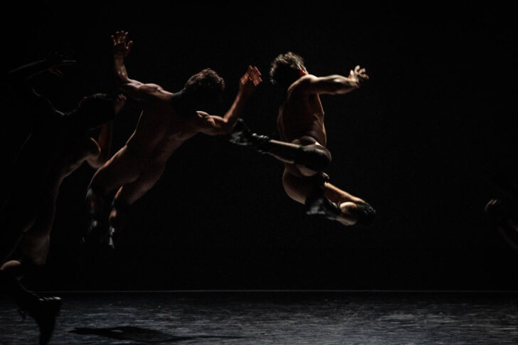 Le plateau est nu, les danseurs aussi. Marina Otero est assise à l'avant-scène à cour tandis que les cinq interprètes envahissent la scène, portant des genouillères. Ils joueront tous une des facettes de la chorégraphe, empêchée de danser par un accident l'ayant clouée à cette chaise dont elle ne se lèvera que pour difficilement rejoindre la scène pour un tableau. Du moins c'est ce que nous sommes amenés à croire. Car il est question du vrai et du faux tout au long de Fuck me : la vérité nue ne se cache pas toujours où on le croit. Les interprètes prennent des postures athlétiques et culturistes avant de revêtir les mouvements de Marina Otero, ceux de ses chorégraphies passées. En parallèle de ces interprétations testostéronées, des vidéos de danses de la chorégraphe, de ses galas d'enfance à ses derniers spectacles, sont projetées en fond de scène. Ce sont ces danses qui font la matière gestuelle du spectacle.
