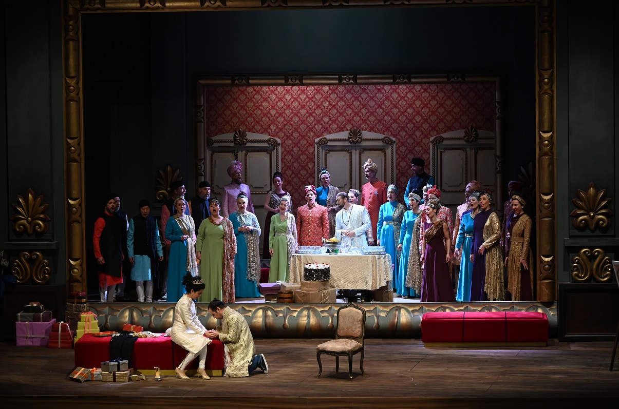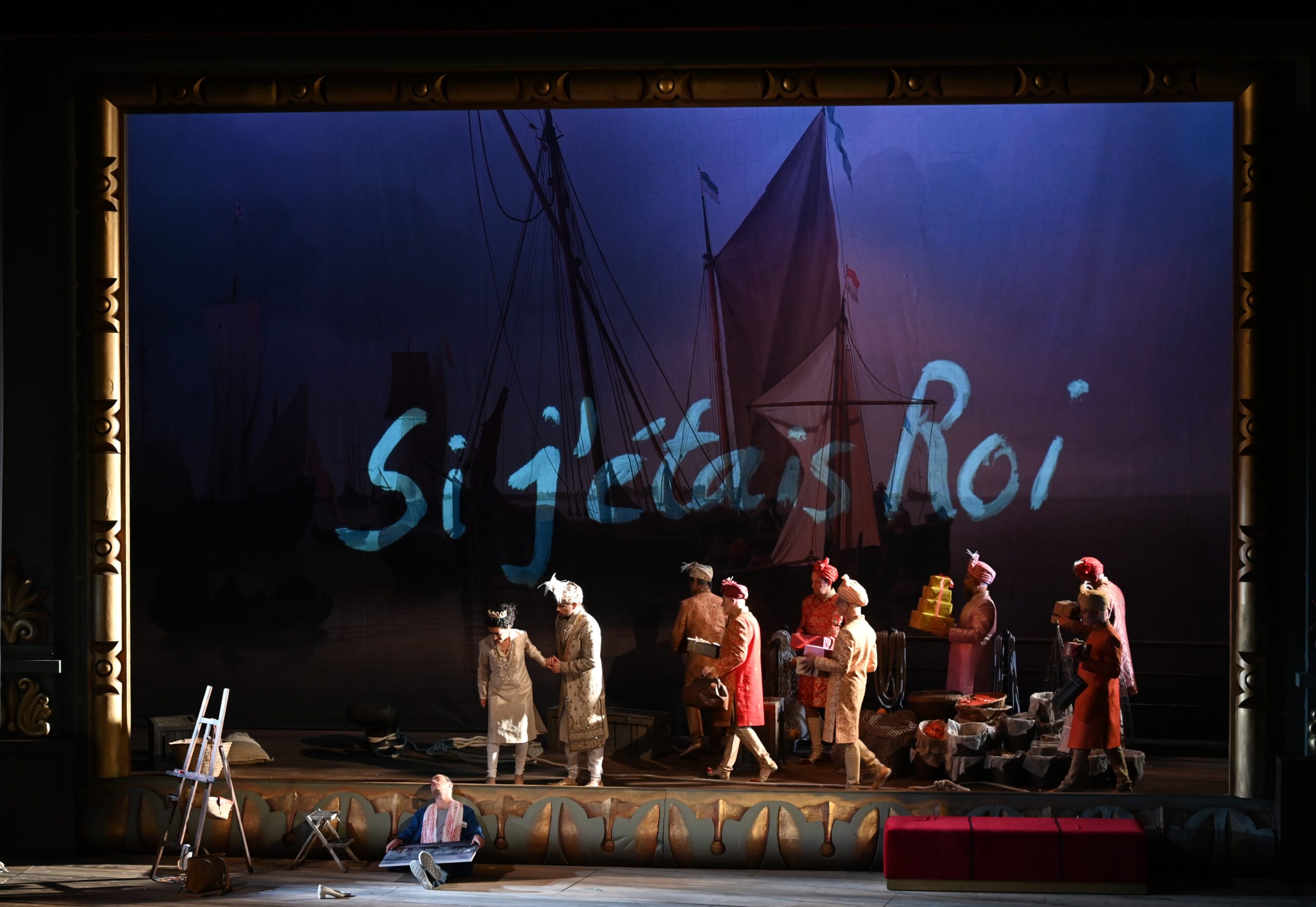 Sont-ce ces trois totems quasi-muséaux qui ont inspiré à Marc Adam le décor de sa mise en scène ? Nous sommes dans un musée dont le technicien de surface fantasme sur une visiteuse elle-même fascinée par une immense marine (Navires au crépuscule sur une mer calme de Willem van de Welde, 1865) qu'elle tente de reproduire sur la toile de son chevalet. L'homme, prompt à l'endormissement, s'endort au pied du tableau, dont les images prennent dès lors vie grâce à la vidéo magique de Paulo Correia. Les costumes pastels de Magali Gerberon se fondent harmonieusement dans le très beau décor de Roy Spahn, qui capte d'emblée le regard et les sens avec son immense cadre aux dorures inspirées de celles du cadre de scène et des motifs bordant le toit de… l'Opéra de Toulon. « Partons sans bruit, partons partons… » : passant comme une ombre sous les mots de ce nouveau Tamino, un hommage à La Flûte enchantée donne le signal du voyage et d'une très coctalienne traversée du miroir. En route pour Goa, comptoir des Indes…