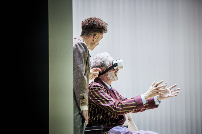 Si Glass avait imaginé l'histoire racontée précisément du point de vue de Gérard, Phia Ménard a opté pour un récitant narrateur dédoublé du personnage, « multifonctionnel » au sein de la maison de retraite. C'est au très étonnant Jonathan Drillet qu'échoit ce rôle à la fois symbolique et médiat. Il est une sorte de réincarnation très calibrée du jeune Cocteau à la fois par son ton, par son attitude délibérée de dandy et par une ressemblance physique certaine (ne serait-ce que la coupe de cheveux du jour). Avec un à-propos presque désinvolte et une implication superlative, il s'empare du texte et notamment son long monologue–intermède, ajouté au mitan du spectacle, interrogatif reprenant une part importante du court-métrage « Jean Cocteau s'adresse à l'an 2000 » du 12 juin 1962.