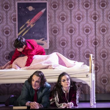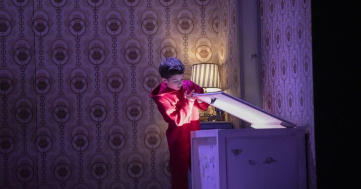 C'est Richard Brunel également qui assure la présente mise en scène, mêlant efficacité dramatique et humour décalé. Toute cette mécanique du rire est huilée et millimétrée, sans pléonasme avec la si spirituelle partition, et laisse ça et là suffisamment d'espace et de suspens pour laisser au spectateur le plaisir de s'esclaffer. L'idée la plus géniale est de dédoubler le personnage de Bébé, à la fois petit garçon de sept ans dans les scènes extrêmes et ailleurs adulte filiforme presque maladroit du haut de son double mètre et au comportement quasi autiste par sa fonction de refus : l'irrésistible Tibor Ockenfels apparait soudainement quasi nu, juste ceinturé d'un improbable lange pour adulte en guise de tutu, provoquant l'hilarité générale du public avant de revêtir un pyjama identique à celui de sa doublure infantile !