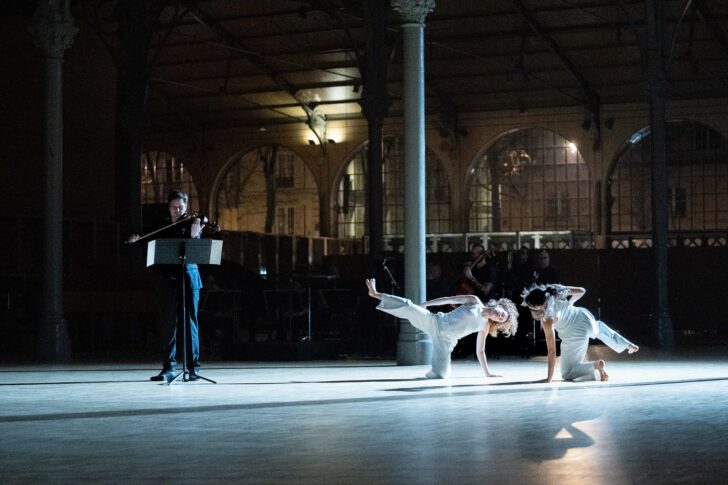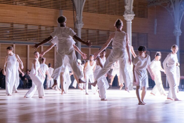 Dans la grande halle nue, où le public est assis sur trois côtés autour d'un parterre naturellement délimité, les danseuses et danseurs issus du Cndc-Angers et du Conservatoire de Paris entrent sur une scène aux lumières tantôt froides ou chaudes jamais trop appuyées de Victor Burel, pendant que l'Ensemble Intercontemporain interprète intégralement deux ouvrages de Ligeti. Initialement inscrites en plus des deux partitions effectivement jouées, les Dix pièces pour quintette à vent semblent avoir été finalement occultées du programme, pour ne plus proposer du compositeur hongrois que la Sonate pour alto et le Concerto de Chambre.