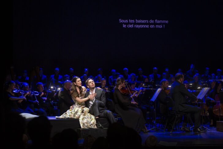 Au lendemain d'une telle soirée, au moment où reviennent en mémoire les instants vécus, l'envie est forte de tous les faire revivre dans un récit. Mais en même temps se profile un désir de les tenir au fond de soi, comme un trésor qu'on ne peut partager parce que les mots n'auront jamais ni les couleurs, ni les impressions que le cœur profond a pu ressentir. Ainsi, quand, au début du deuxième acte, l'orchestre entame une longue mélopée traduisant l'une des plus belles pages de la littérature musicale, la grandeur de Charles Gounod prépare l'auditoire à la cantilène sublime de Roméo « Ah ! lève-toi, soleil ! ». On se dit que cette musique est si belle, si inspirante qu'elle ne peut qu'être sublimée dans le chant. Et pourtant, ce ne sont que des notes, des points alignés sur des portées. Mais lorsque Benjamin Bernheim s'empare de cet air, nous devenons tous ce Roméo amoureux qui demande au soleil de se lever, de faire pâlir les étoiles pour qu'il puisse voir sa Juliette. Vêtu d'une simple chemise blanche, d'un pantalon noir, entouré de deux sévères estrades, devant une scène nue, habitée par un orchestre avec sur le fond les têtes dépassant d'un chœur mixte, rien n'est vraiment là pour créer un décor propice à ce que le chanteur veut nous faire entendre. Mais, quand son chant s'élève, intense, beau, tantôt éclatant puis soudain suppliant, la magie de l'interprète opère et chacun voit au-delà de la nudité scénique, cette place de Vérone dans la nuit profonde, le balcon et, l'amour.