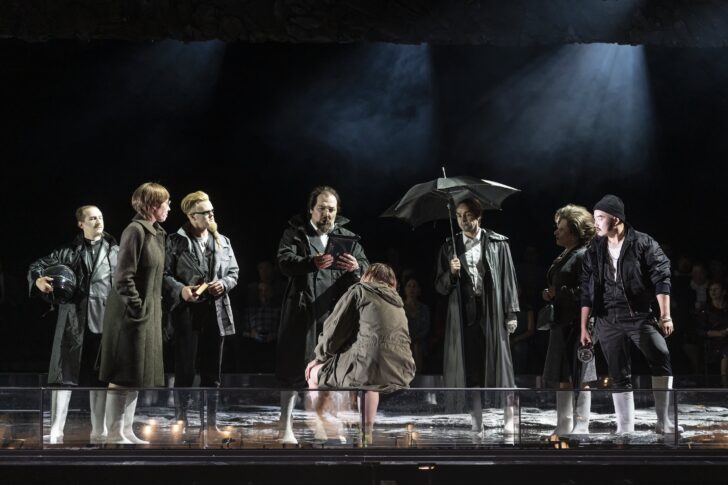 Dernier des trois théâtres nationaux de Bavière à avoir monté Peter Grimes au cours de l'année 2022, après Munich et Nuremberg, le théâtre d'Augsbourg est le plus petit des trois, mais c'est lui qui se tire le mieux d'une œuvre tout sauf facile. Depuis la fermeture soudaine de sa salle historique en 2017, il n'a pas la tâche facile : son domicile provisoire dans un ancien site industriel à l'écart du centre-ville offre des ressources scéniques très réduites, sans plus de dessous que de dessus, sans scène tournante ni dégagements ; le metteur en scène Dirk Schmeding s'accommode de ces limites pour proposer un spectacle simple, d'une grande lisibilité, mais pas sans efficacité théâtrale. Qui plus est, cette simplicité a aussi des vertus musicales : les scènes de foule au pub ou le dimanche matin virent souvent à la confusion sur scène, en partie il est vrai à cause du compositeur lui-même qui multiplie les voix du chœur et des solistes sur un accompagnement orchestral complexe. Ici, l'équilibre n'est jamais rompu, la ligne musicale reste lisible : c'est déjà beaucoup. Le chef Domonkos Héja, directeur musical de la maison depuis 2015, tient ses troupes, aussi bien l'orchestre que le chœur, et la comparaison avec d'autres productions de Peter Grimes montre bien que c'est déjà beaucoup.
