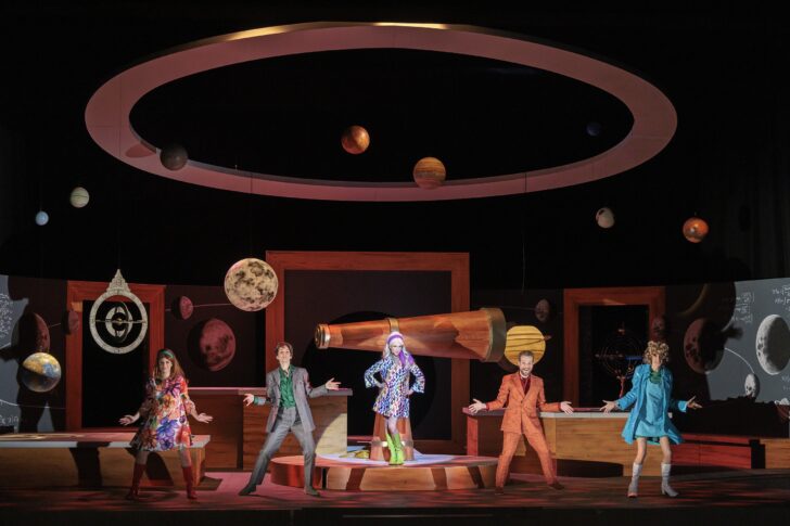 Pierre Thirion-Vallet a choisi, pour cette coproduction entre la maison qu'il dirige à Clermont-Ferrand et l'Opéra-Théâtre de Metz qui en accueille la création, de monter Il Mondo della Luna, dont le livret est comme souvent chez Haydn peu attirant ; mais quoi de plus attirant qu'un autre monde comme alternative au nôtre ? Le metteur en scène choisit d'encadrer l'action par un récit surimposé à la manière de Dmitri Tcherniakov : ici, nous sommes en 1969, l'homme n'a pas encore marché sur la lune (mais ça ne saurait tarder), Russes et Américains s'espionnent, le savant russe Ecclitico entend utiliser la famille du responsable américain Buonafede alias Goodfaith pour faire pression sur lui – mais la NASA est plus maline. Pourquoi pas, mais cette sage comédie n'est au fond pas beaucoup plus profonde que la banale comédie matrimoniale imaginée par Goldoni, dont les livrets n'ont hélas pas le même mordant et le même sens des entre-deux sentimentaux que ses pièces de théâtre. Et le spectacle ne saisit pas même ce que lui offre l'œuvre : la misogynie obsessionnelle dont Buonafede ne cesse de faire preuve tout au long de l'opéra est présente, mais elle est simplement montrée comme ridicule, produit de la sottise du personnage au demeurant sympathique : c'est un peu léger, d'autant que c'est un véritable moteur de l'action, combiné à la demande inextinguible de liberté des personnages féminins que Goldoni a souvent mis en scène.