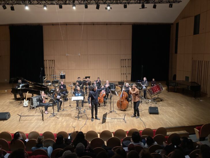 Cornucopia, pour baryton, trompette soliste et ensemble d'Augustin Braud qui referme le concert nécessite une courte préparation du plateau (branchement de la guitare et de l'orgue électriques) qui ne gâche en rien la fluidité du spectacle emmené par nos quatre brillants comédiens, Émilie Diaz, Laetitia Nagrodski, Lucas Sekali et Léonor Vanryssel dont on salue le talent déployé pour défendre les textes qu'ils ont choisis. Entendu dès le début de la soirée, celui de Cornucopia est de la main même du compositeur, issu de témoignages de victimes de burn-out qu'il a compilés et réécrits. Le propos percutant s'interrompt quatre fois pour laisser place aux strophes poétiques de Rainer Maria Rilke d'un tout autre registre littéraire.