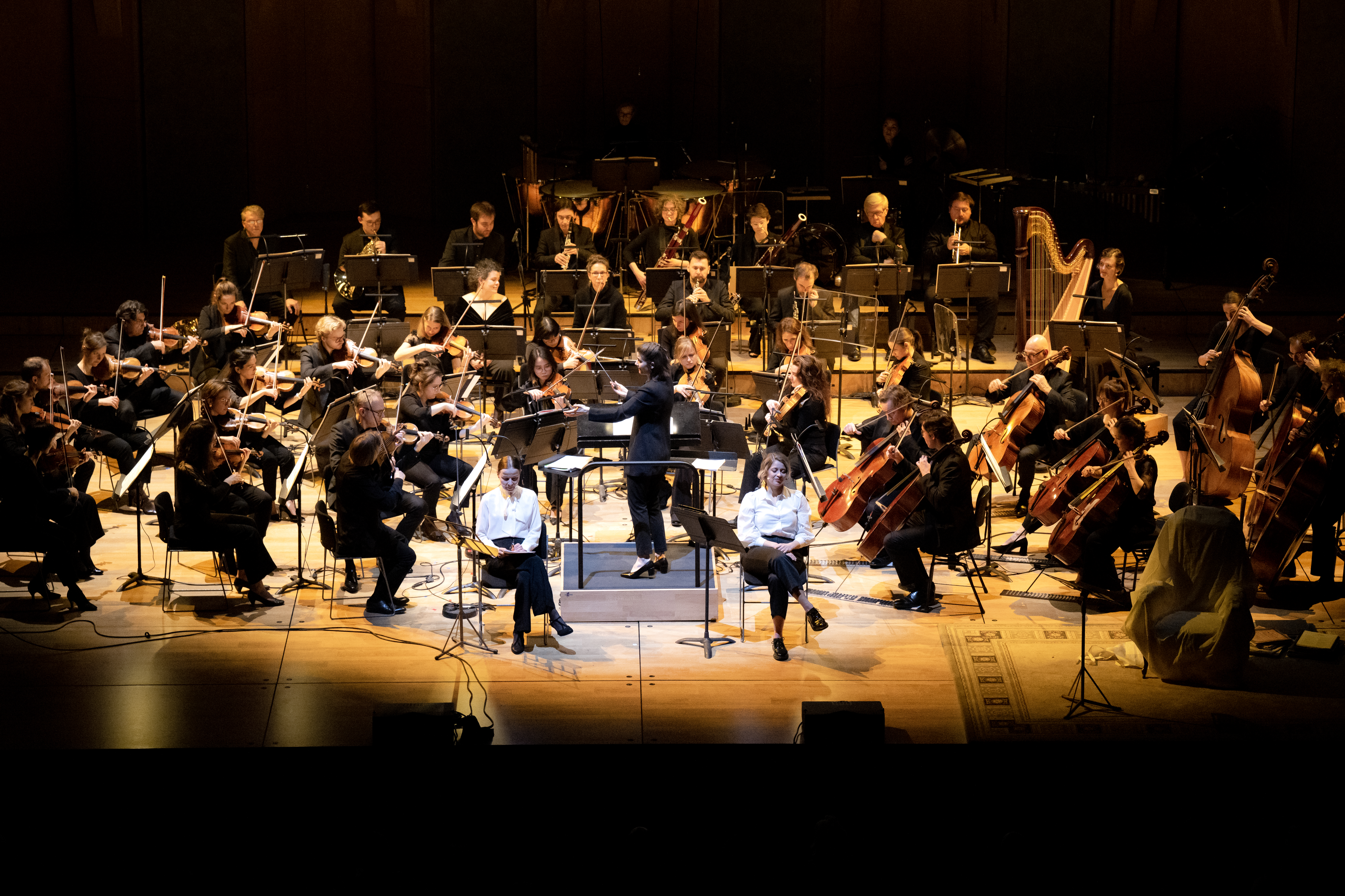 La soprano Marie Perbost entre ensuite pour chanter l'un des Trois Poèmes de Stéphane Mallarmé de Ravel, et si l'artiste s'est faite annoncer malade en début de représentation, nous prévenant qu'elle ne chanterait pas la dernière pièce, elle se révèle en réalité limitée à l'aigu dans ce Soupir ravélien. Nous apprendrons après le concert que les enregistrements de son nouvel album la veille ont duré jusque très tard dans la nuit. Un rapide changement de plateau, toujours à gauche puisqu'à droite se trouvent quelques éléments de décors dédiés à une petite mise en espace pensée par Chloé Lechat, permet d'installer la harpe et d'enfin profiter de la musique de Tailleferre. Très agile, la harpiste Valeria Kafelnikov débute le Concertino sous l'accompagnement des cordes de l'ensemble orchestrale, avant de se démarquer lors d'une très belle cadence.