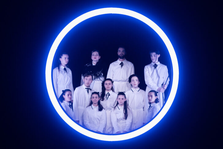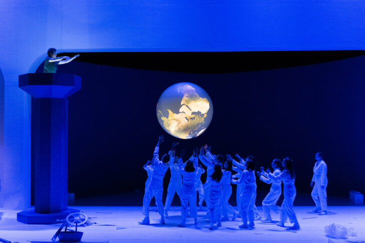Lorsque le spectateur pénètre dans la salle, c'est pour s'y faire admonester par la fureur d'un dieu juché au sommet d'une colonne bleue tutoyant le ciel. Rodomontades quant aux capacités infinies de l'être humain à souiller son propre lieu de vie, injonctions à presser l'installation de chacun,… on se laisse malmener par ce dieu croqué avec humour, auquel ne manque que l'auto-critique quant à sa propre responsabilité d'avoir façonné une créature aussi imparfaite. Durant ce prologue parlé sur fond de choral s'installe progressivement, autour du couple Noé, la jeune génération, dont l'immaculé vestimentaire se détache de la noirceur d'un fond de scène encadré d'arcade romanisantes, blanches elles aussi. Le bleu envahira une scénographie très soignée dans laquelle on reconnaît la patte friande de symbolisme, de Silvia Costa, dont les spectacles vus à Aix comme à Nancy et Dijon avaient su capter l'œil et le cerveau.