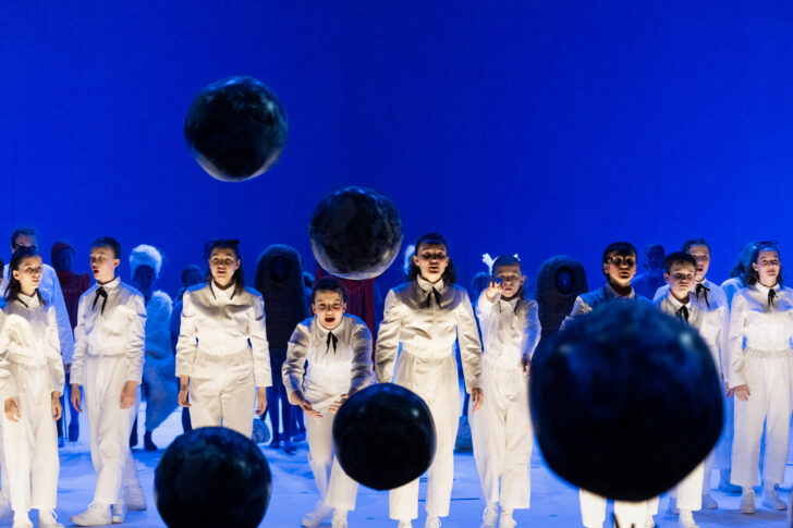 Si l'on peut regretter le choix d'avoir tourné le dos à l'instrumentarium originel de ce bref opéra de 50 minutes, que son destin voyageur avait voulu minimal (dix instrumentistes, mais, donnée essentielle du style brittenien, une grande variété de timbres : cordes, flûte, piano, clochettes, orgue), on loue la musicalité des rescapés du naufrage musical : le piano de Grégory Kirche et les percussions de Gisèle David sous le geste maîtrisé de Karine Locatelli. Noé et son épouse sont confiés à des solistes professionnels (solides Romain Bocker et Clémence Poussin), le personnage principal restant, comme dans plus d'un opus du grand compositeur anglais, la voix d'enfant. La Maîtrise de l'Opéra de Lyon s'impose dans cet opéra ultra-mélodique et accessible dès la première approche, par sa justesse, la pureté du son, l'aisance scénique.