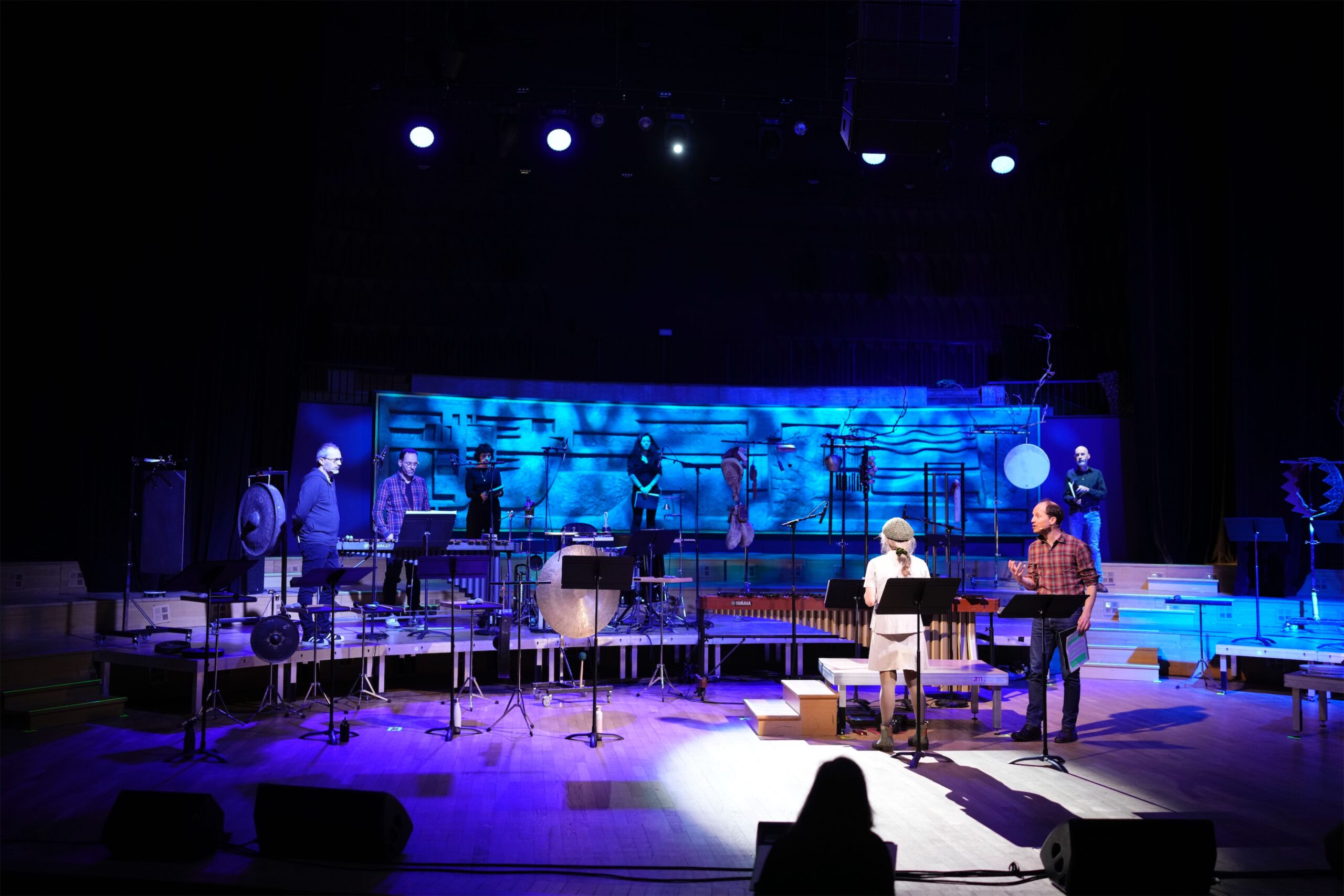 Devant un parterre d'enfants, eux bien accompagnés par leurs parents, les comédiens trouvent un ton volontairement naïf pour s'adresser plus aux bambins qu'aux adultes, bien soutenus par les cimbales et glockenspiele sous les mains d'Emmanuel Curt, mais aussi régulièrement par les gongs dans celles des quatre chanteurs du Quatuor Stamen et plus particulièrement de David Lefort. Issue du Chœur de Radio France, la formation chorale de deux hommes et deux femmes, sur les tessitures de mezzo (Sarah Breton), soprano (Marie-George Monet), ténor (David Lefort) et baryton (Jean-Emmanuel Candenot) associe des chants de toutes les époques, choisies par les chanteurs eux-mêmes autour du conte.