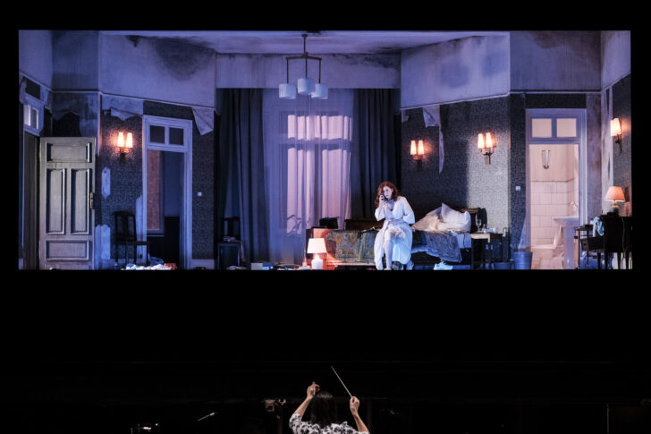 Imaginé au départ pour Maria Callas, dont la façon de pousser les hommes pour s'octroyer le premier plan aux saluts avait amusé avant d'inspirer l'éditeur de Poulenc, Hervé Dugardin : « Ce qu'il faudrait écrire pour elle, c'est La Voix humaine, puisqu'il n'y a qu'une femme, elle aurait tous les applaudissements », l'opéra fut créé in fine par la Callas du grand Francis, son « rossignol à larmes » (il signait Poupoule) : Denise Duval. De Rossellini à Almodovar, la pièce est passée par plus d'un gosier familier : Anna Magnani, Simone Signoret, Tilda Swinton. Jusqu'à Py et Mitchell, l'opéra a bellement complété ce mythique gynécée : Stéphanie d'Oustrac (encore à Glyndebourne 2022), ou Barbara Hannigan à la Philharmonie de Paris en 2019, qui a la géniale idée de chanter le rôle en dirigeant l'orchestre, face à un écran renvoyant en surplomb l'image de son visage et de son corps littéralement mis en scène par les soubresauts de la partition. Patricia Petibon ne pouvait manquer ce « concerto pour une voix ». Déjà gâtée par Py à Paris, qui parle d'elle comme de sa « petite sœur », la revoici remarquablement dirigée par Mitchell. Les deux femmes se connaissent bien pour avoir donné le jour à une Alcina mémorable à Aix-en-Provence en 2015. La Petibon fait un usage très personnel et souverain des silences, la chanteuse et la comédienne se consumant de concert entre chambre et salle de bain en arrière-plan, assumant crânement la féminité la plus quotidienne, comme changer un tampon d'une main en téléphonant de l'autre. On aurait été curieux de trouver dans le richissime programme de salle le texte de l'homme invisible que Mitchell, par souci de véracité dramatique, a tenu à écrire pour son interprète. Jouant à fond la carte de la sororité voulue par l'Opéra du Rhin, aussi libres que Prêtre et Duval dont la version discographique se démarquait çà et là des indications précises de Poulenc, Petibon, Mitchell et, dans la fosse, la remarquable cheffe française Ariane Matiakh à la tête d'un Philharmonique de Strasbourg dense et précis, font de ce lamento de l'amour à sens unique un suspense étouffant.