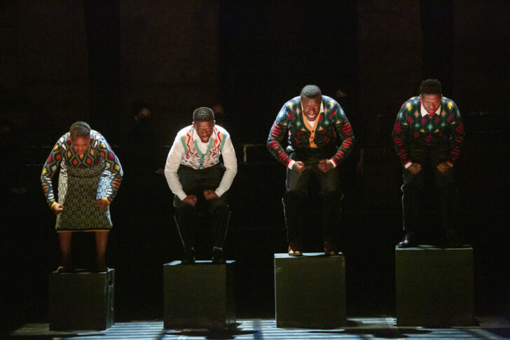 Un danseur et quatre chanteurs sud-africains incarnent les chanteurs, depuis leurs études dans l'école dirigée par des missionnaires à leur arrivée à Londres. l'Ensemble Aedes, sous la direction de Mathieu Romano, juchés en arc de cercle sur des plots noirs, forme une foule hostile et raciste qui accueille ces chanteurs venus des antipodes.