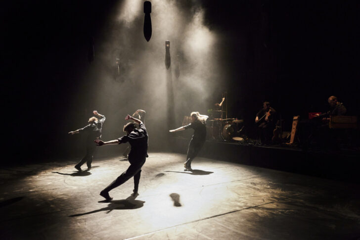 La pièce est structurée de manière linéaire, autour d'une succession de tableaux liés entre eux par une progression narrative simple et des transitions nourries d'une certaine théâtralité. Avant le drame, le temps est à la fête et la musique traditionnelle, jouée en direct, résonne depuis la large estrade positionnée en arrière-scène. Les trois musiciens talentueux passent d'ailleurs d'un instrument à l'autre durant toute la pièce (violon, accordéon, tambours, percussions légères, etc.) et donnent même de la voix pour créer à quelques reprises de belles harmonies vocales avec les danseurs.