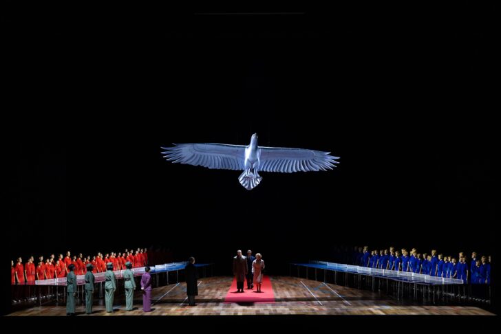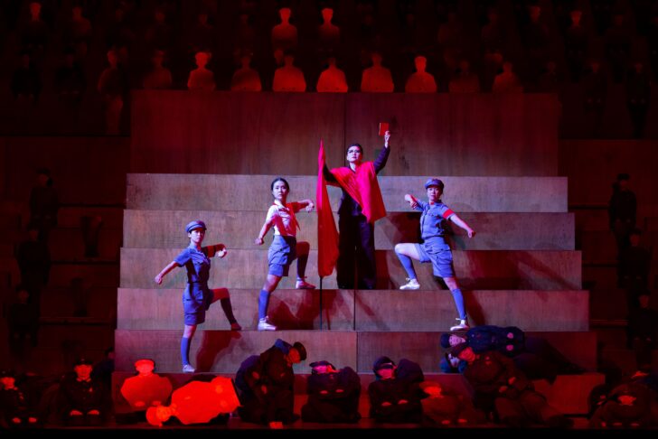 Maintenant la pulsation rythmique et les accents asymétriques qui découpent le flux sonore, la musique de l'acte II sonne plus claire et moins fort. Pat Nixon (Renée Fleming radieuse) découvre la Chine en compagnie d'un dragon rouge, aussi monstrueux qu'affectueux, celui de l'Opéra de Pékin qui nous fait basculer dans le merveilleux. La première dame s'arrête à la porte de La Longévité et de la Bonne Volonté pour chanter le deuxième grand air de l'opéra, « This is prophetic », sur un simple balancement de deux accords et le soutien discret du hautbois. L'air est redoutable, traversant un grand ambitus auquel la voix longue et flexible de la soprano (le médium est somptueux) donne toute son ampleur même s'il manque un rien d'intensité à l'air pour habiter l'espace du plateau. Théâtre dans le théâtre, le drame qui se joue dans la deuxième scène de l'acte II, d'une cruauté sans nom, est extrait de « l'opéra modèle » censé exprimer le point de vue de Mao selon lequel l'art sert les intérêts des travailleurs, paysans et soldats, et doit être conforme à l'idéologie prolétarienne. Horrifiée, Pat Nixon, comme Don Quichotte, veut intervenir pour sauver la pauvre paysanne torturée par Lao Si (alias Kissinger)… Jiang Qing, la femme de Mao/Kathleen Kim (soprano colorature), en profite pour reprendre en main la situation dans un air de bravoure aux aigus vindicatifs : « Je suis la femme de Mao Zedong, je parle conformément au livre ».