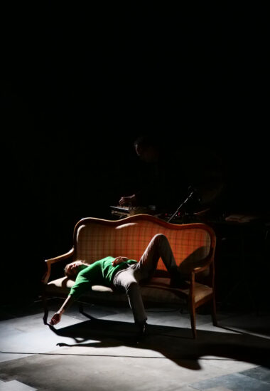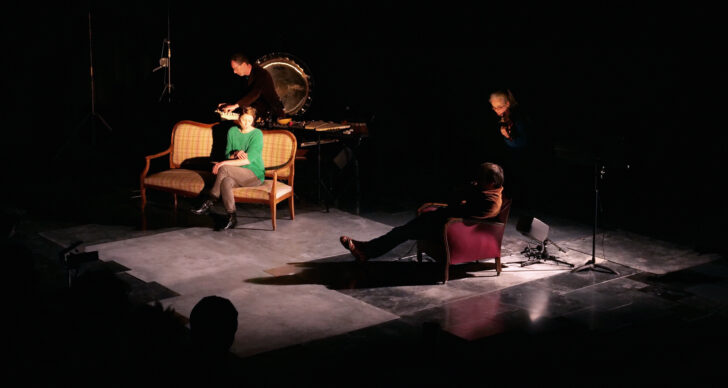 Créé en février dernier au Zef de Marseille, le spectacle réitère la collaboration de Loïc Guénin et de la metteuse en scène Anne Monfort déjà présente dans Le cri d'Antigone. Dans sa mise en scène économe rehaussée des lumières de Vincent Beaume, les deux acteurs, Anne-Gaëlle Jourdain et Grégoire Tachnakian, tiennent la scène durant une petite heure, elle, assise ou allongée sur son canapé avec un micro-lèvres ; lui, un peu à l'écart dans son fauteuil et micro en main. Derrière eux, deux musiciens vont sans cesse interagir : Loïc Guénin aux percussions, claviers analogiques et autres objets sonores ; à sa gauche, la violoniste Alice Piérot qui a également quelques objets sonores à portée de main. Dans ODILE ET JACQUES (ou Jacques et Odile), le texte écrit par Loïc Guénin devient partition, à dire comme au théâtre et à jouer/chanter en synergie avec les instrumentistes.