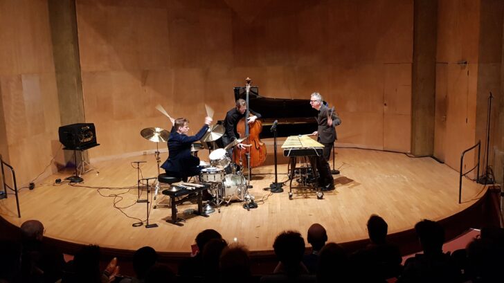Le trio ouvre la soirée avec un mélange de Grammar (2012-2019) et de Beats (2020). Christopher Dell (vibraphone), Christian Lillinger (batterie) et Jonas Westergaard (contrebasse) sont placés en face à face, batteur au premier plan, quasiment dos au public, pour lancer une musique organique, mouvante et débordante d'énergie, dont les ostinatos en accords-piliers au vibraphone s'agencent en colonne vertébrale. Le temps se strie des mille modes de jeu de la batterie, frétillante, électrique – Lillinger est fascinant à observer –, tandis que la contrebasse complète par ses chocs sourds le tourbillon sonore enivrant, qui ménage dans un flux ininterrompu des instants de relative suspension et des retours aux attaques puissantes.