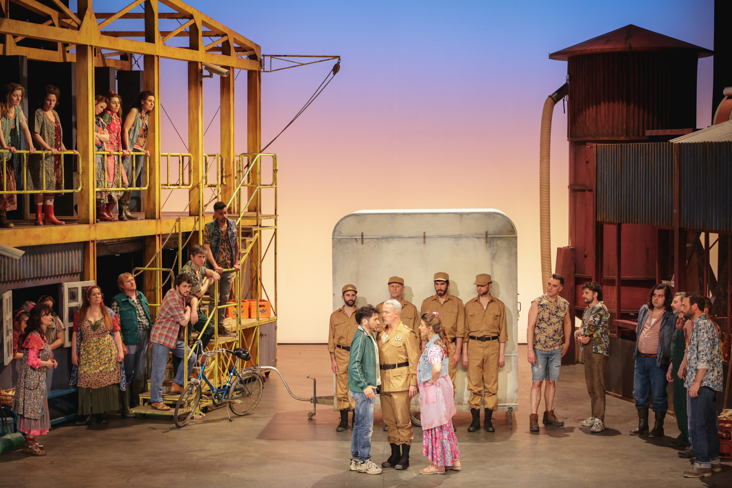 Pour le reste, l'orientation est clairement tournée vers le bouffe, ou tout le monde surjoue, mais avec une véritable capacité à faire rire et à se concentrer sur la qualité du livret, toujours aussi drôle. Dans un décor conséquent (Alwyne de Dardel) où l'on préfère le tapis roulant à la fausse fusée/silo/boîte de nuit kitch du fond, c'est par des couleurs chaudes qu'on retrouve également dans les costumes (Marianne Delayre) et les lumières (Paul Beaureilles) que l'on profite des nombreuses situations comiques. Et pour ambiancer tout cela, on trouve notamment Dulcamara, ici gentiment alcoolique et ringard grâce à Giorgio Caoduro, aussi risible dans ses scènes de groupe qu'intéressant pour son air, particulièrement bien dynamisé par la trompette solo en fosse. Dans ce qui semble être les années 60, Marc Scoffoni entre en habits de soldat avec une prononciation volontairement trop appuyée sur de nombreux passages, livrant de beaux graves quand il le faut. Marie-Bénédicte Souquet campe une Giannetta heureuse, un peu avide de souffle dans la longueur, tandis que le Chœur de Chambre Mélisme(s) se fait remarquer par la qualité de sa préparation (Gildas Pungier et Guillaume Rault).