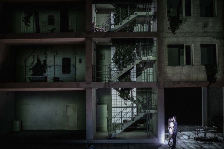 La Katia de Wysocka habite un immeuble vu en coupe dont les neuf appartements occupent l'intégralité du cadre de scène. Un dispositif vertigineux, au spectaculaire problématique, sa pleine visibilité ne pouvant s'appréhender que du premier balcon. Lacéré par une volée d'escaliers, cet univers bétonné laisse entrevoir, comme dans le Playtime de Tati, l'intérieur des intérieurs (un ameublement spartiate : un canapé, une baignoire, une douche), mais reste muré à cour au-dessus d'un tourniquet de jardin d'enfants. Sur ce décor tagué sporadiquement des pensées profondes de l'héroïne, de quelques bouffées poétiques (vidéos de pieds, de mains), s'est invitée l'humidité comme s'invitera à vue, avant le duo final, une végétation rampante. Un environnement aussi désolant que désolé, mais qui, en dépit de son introduction et de sa conclusion, reste assez peu habité par la direction d'acteurs d'une metteuse en scène surtout occupée par la résurrection de son héroïne.