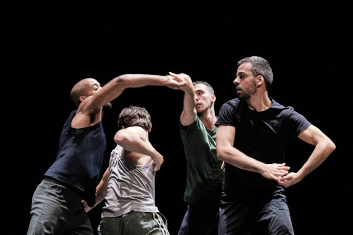 Les bras sont décidément à l'honneur dans ce programme avec N.N.N.N, étonnant exercice de style crée en 2002 pour quatre danseurs masculins et signé William Forsythe. Les quatre garçons (anonymisés par les quatre N. du titre du ballet) partent à la recherche de leur main, puis la trouvent chez l'autre, et tout se déroule dans un grand jeu de coordination des corps. L'un prend avec force le bras de l'autre, qu'il fait chuter, et c'est au tour de cet autre de tirer le membre d'un troisième, etc… Tout cela va très vite, et il s'agit d'être à l'écoute permanente de son partenaire. D'autant que la musique ne peut les aider, puisqu'elle n'existe pas. Le seul son de leur souffle (dont l'unisson s'avère nécessaire) peut les guider dans le timing de ce grand jeu où il s'agit, du coup, d'écouter la danse. On comprend bien le sous-texte de Forsythe : dans la danse, il faut faire confiance, écouter le poids de son corps pour en mesurer la contrainte qu'il exerce sur son partenaire, être passif et actif à la fois.