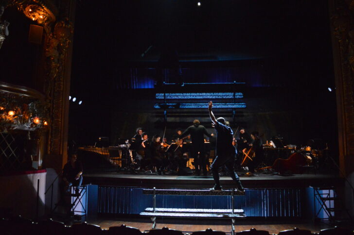 Paris. Théâtre de l’Athénée. 12-V-2023. Nicolas Canot (né en 1983) et Lauriane Maudry : Prélude/Variation I pour clarinette basse et électronique d’après Steve Reich, New York Conterpoint ; Régis Campo (né en 1968) : Street Art ; Nicolas Canot et Pierre Pradier : Interlude/Variation II, pour guitare électrique et électronique d’après Steve Reich, Electric Counterpoint ; Steve Reich : Radio rewrite pour ensemble ; Nicolas Canot et Eva Zavaro : Interlude/Variation III, pour violon et électronique d’après Steve Reich Violin Phase ; Pascal Zavaro (né en 1959) : Silicon Music ; Nicolas Canot et Nadia Bendjaballah, Calum Saunière, pour deux groupes d’applaudissements d’après Steve Reich, Clapping Music ; Fabien Cali (né en 1983), Niviana’s Devil Drop, pour ensemble et freerunners. Ensemble Les Apaches ! Eva Zavaro, violon ; Pierre Pradier, guitare électrique ; Lauriane Maudry, clarinette ; Nadia Bendjaballah et Calum Saunière, percussions ; Mise en scène, Gordon ; chorégraphie Sarah Silverblatt Buser ; création lumière Arthur Cemin ; vidéo, Cynwal Hoper ; création graphique (banc), Cheuminer. Simon Nogueira, free-runner ; danseur et acrobate, Andrea Catozzi ; French Free Run Family ; direction : Julien Masmondet