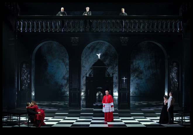 Pour sa mise en scène, Olivier Py entend replacer l'œuvre dans une certaine in(ter)temporalité, coincée entre l'époque de l'intrigue historique et celle de la composition de l'ouvrage : après tout, pourquoi pas ? La Troisième République ne réinstaure-t-elle pas la possibilité du divorce, et n'établit-elle pas à sa manière un « schisme » par la laïcisation progressive de l'État, menant à la loi de séparation avec toutes les Églises en 1905n? Si bien que la tenue d'apparat du Roi n'est sortie que pour la séance de photo et la galerie…et troquée pour un costume plus moderne et moins encombrant…
